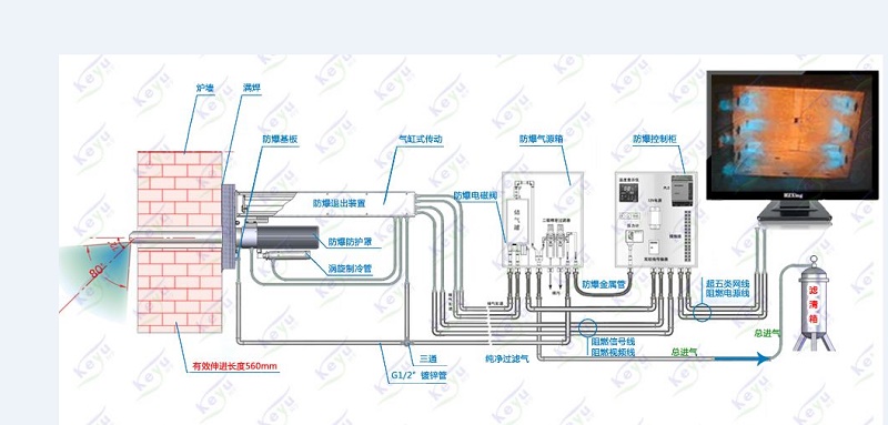 鏡頭能自由伸縮爐內(nèi)進(jìn)行自由視覺觀察;為了減少窯爐熱損耗,節(jié)約能源,在爐壁內(nèi)安裝耐高溫陶瓷管,盡量減少爐壁開孔尺寸。